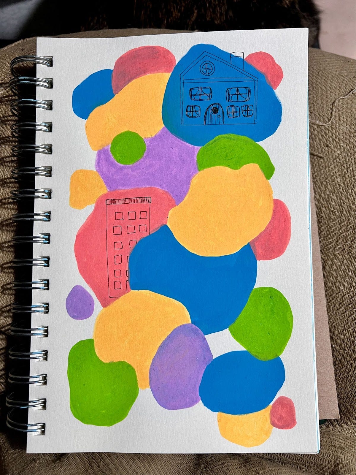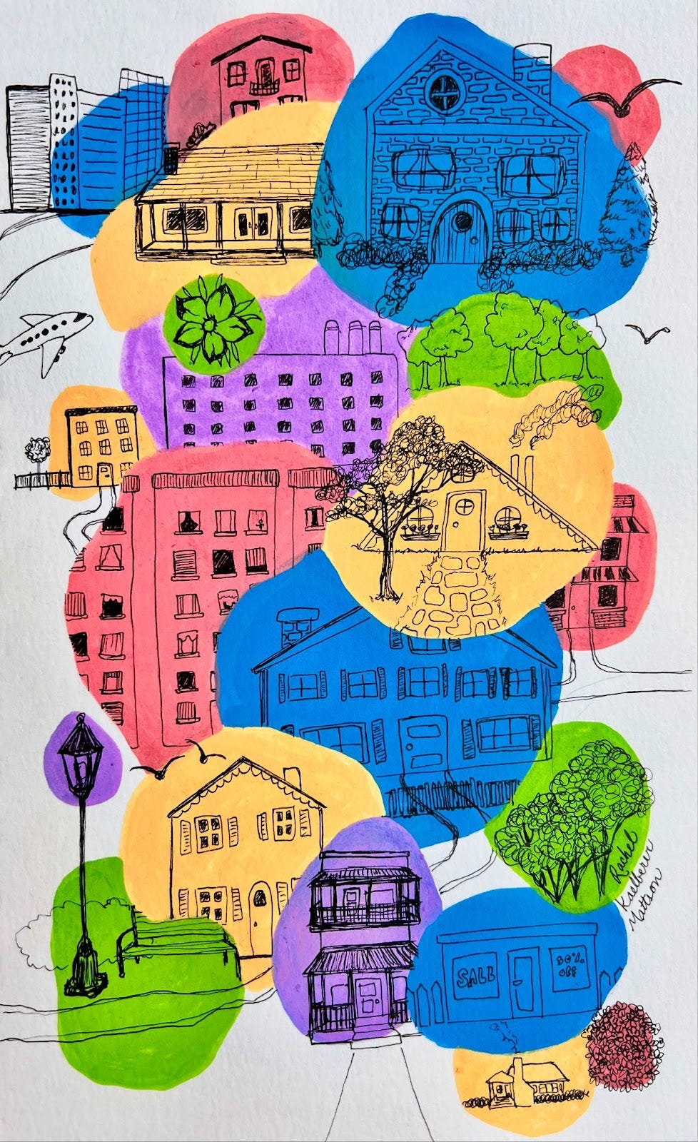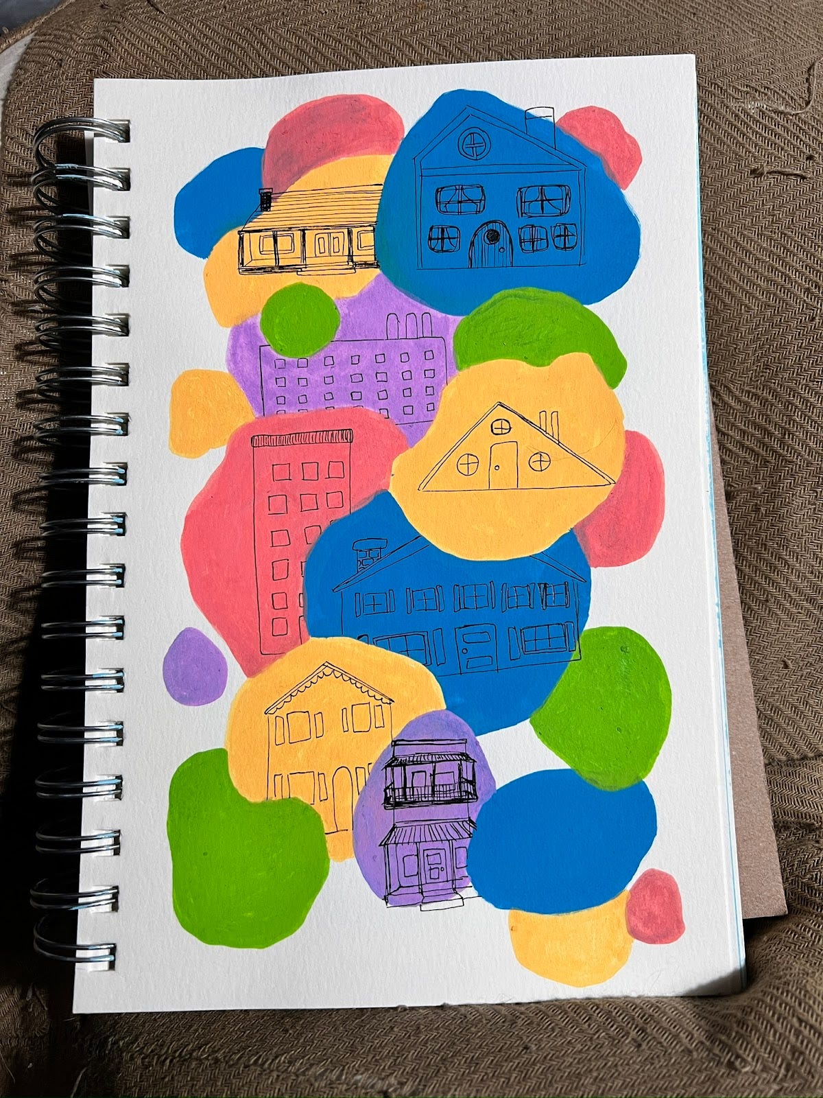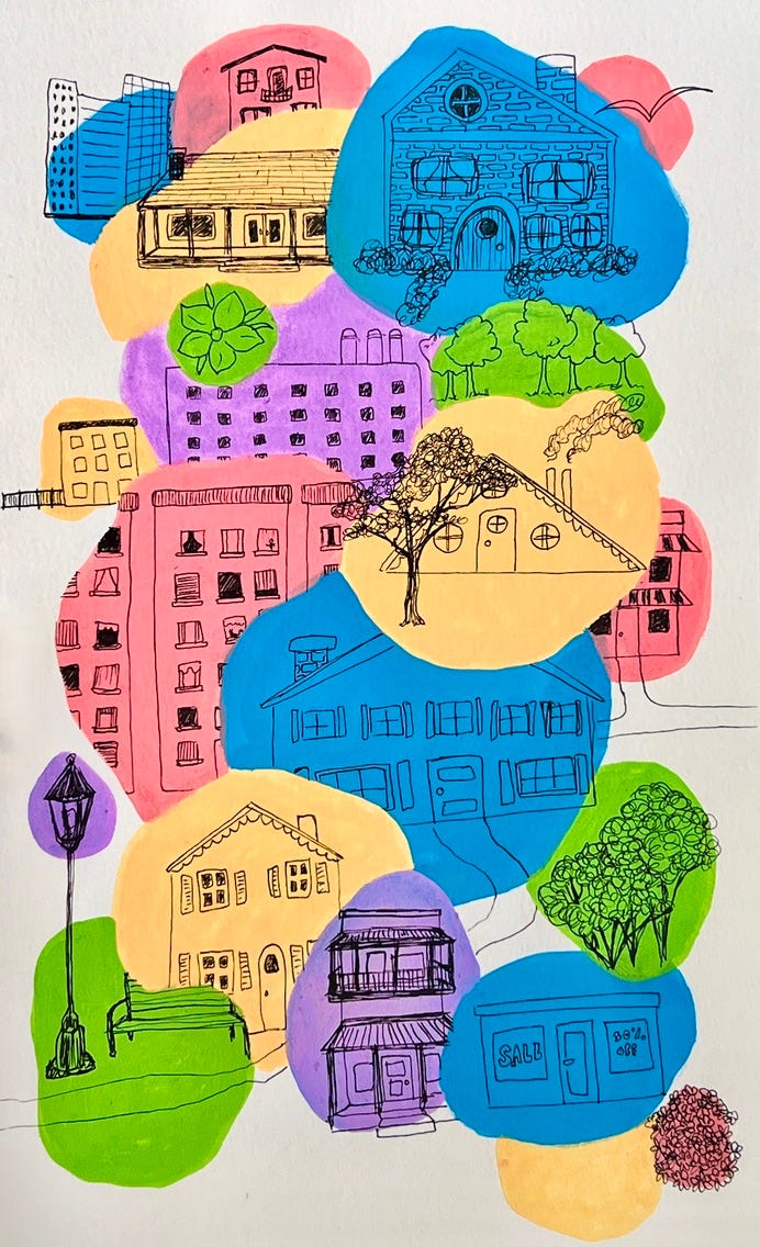 Keep going, don’t worry about detail right away - just do general shapes/outlines as you go. Think about the different style of houses in your neighborhood, your city. You’ll naturally fill in some detail as you go, that’s fine, but don’t fret about getting it “just right.”